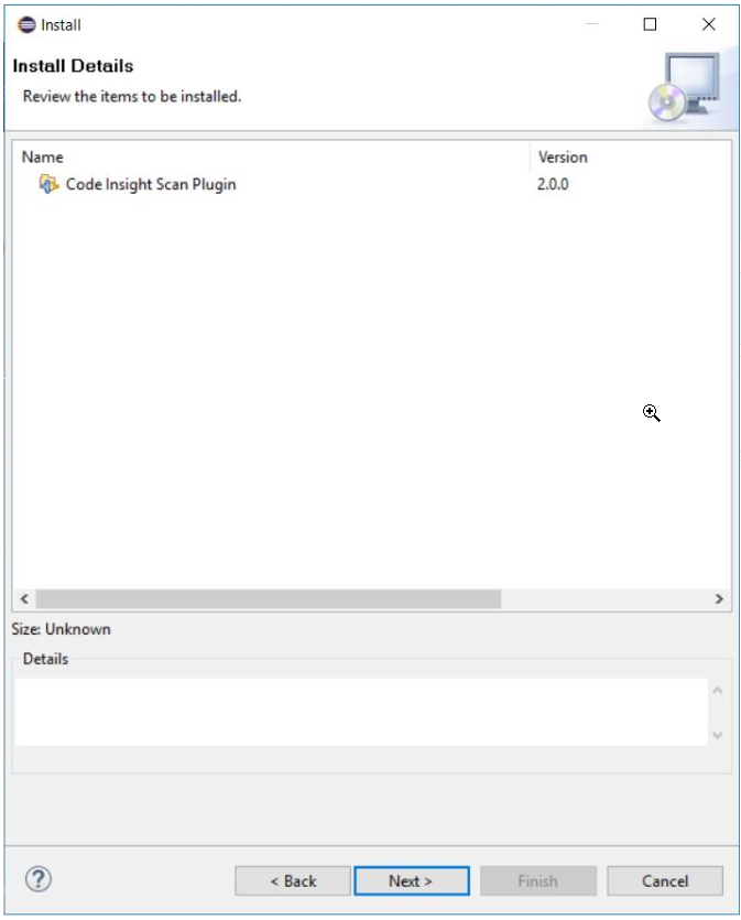 - Click the checkbox next to the Code Insight Scan Plugin entry, and click Next . The Install Details window is displayed, listing the plugin you are preparing to install.