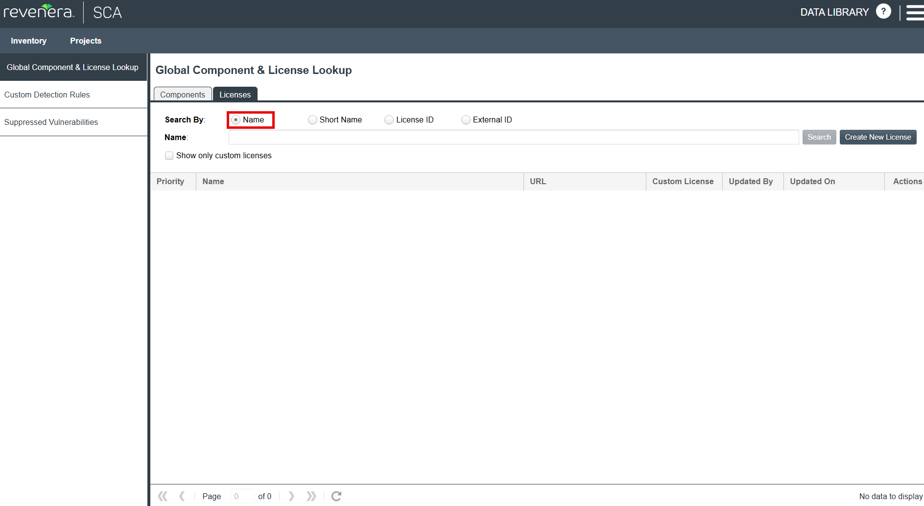 Starting in this release, a new search option, Name , has been introduced on the Licenses tab of the Global Component & License Lookup tab. This option enables users to search for licenses in the Code Insight Data Library by entering a string associated with the license name. To use this search criterion, input a string of at least three characters that appear in the license name into the associated Name field.