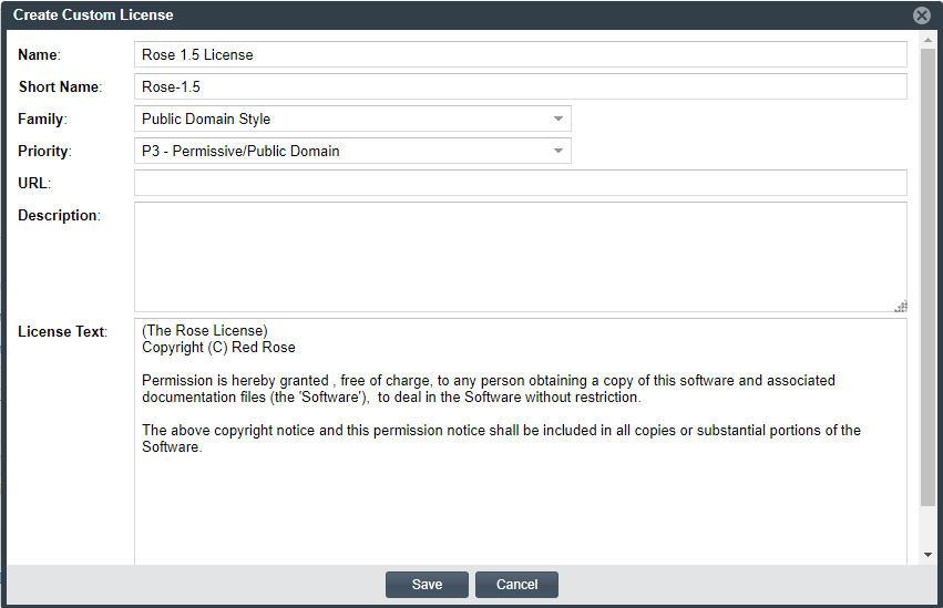 - From the Create Custom License window, provide the license properties. Name , Short Name , and License Text are required fields. For a description of the properties, see Custom License Properties.