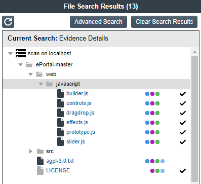 - Filter to a list of codebase files in the File Search Results pane that contain only selected evidence—Select the checkbox to the left of one or more evidence instances in the list on the Evidence Details tab, and click Search Files in the lower right of the tab. (When you select multiple evidence instances, the search uses OR logic to obtain the results.)
