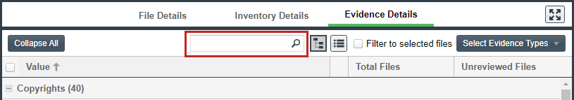 - Search for evidence that contains a specific string—Enter the string in the search box at the top of the Evidence Details pane, and then click the Refresh