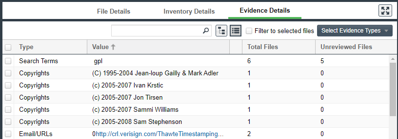 - By default, the evidence is displayed in a tree-view, where you can expand or collapse the evidence instances (entries) under each evidence category ( Copyrights , Email/URLs, and so forth).