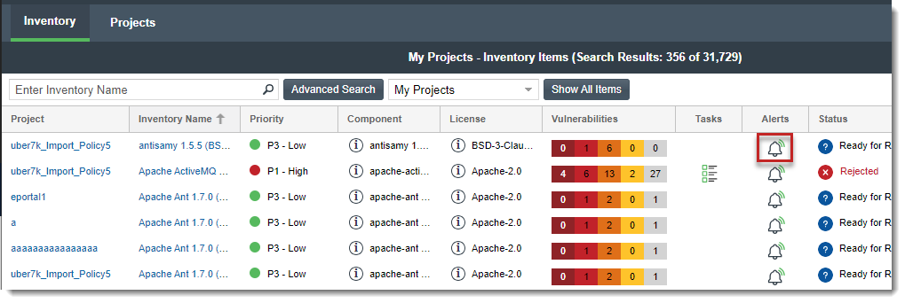 - To view the open and closed alerts for a given inventory item associated with a given project, locate the item, and click the