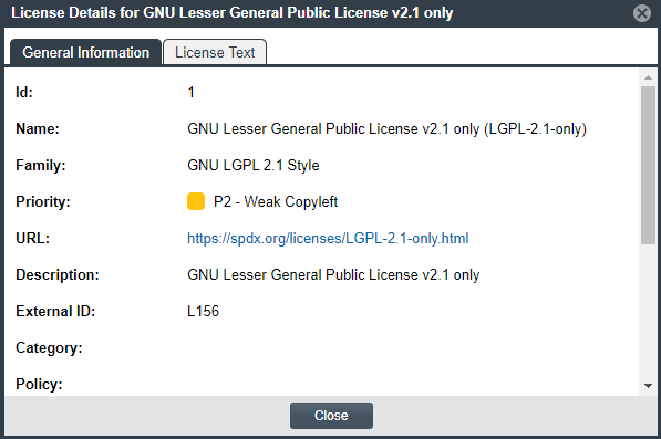 - A General Information tab that lists details such as the name of the license, its family, and the license priority assigned by Code Insight.